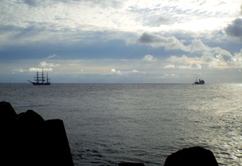 Kelly Burns' photo above shows MV Baltic Trader framed by the rigging of the Bark Europa. | |