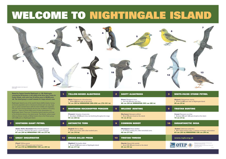 The welcome sign for Nightingale Island has information on the many bird species that breed there. - More >>