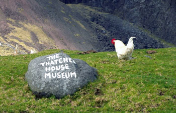 Cockerel and sign approaching the Tristan Thatched House Museum with the 1961 volcanic cone as a backdrop |