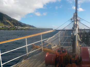 Poor weather prevented the Bark Europa's Tristan visit continuing for a second day and the sailing ship therefore departed at 09.30 GMT on 14th April bound for Cape Town. |