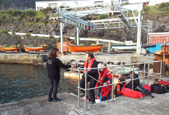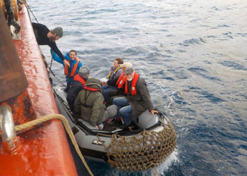 | Bark Europa carried a crew of 16 and 40 passengers. Photos above show passengers boarding a RIB left and being welcomed at Calshot Harbour. |