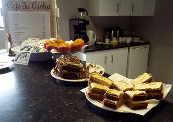 Scenes left and below of passengers in and around the Café da Cunha in the Post Office and Tourism Centre. |