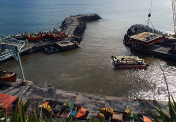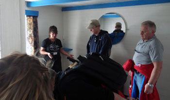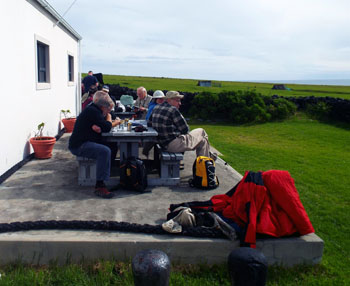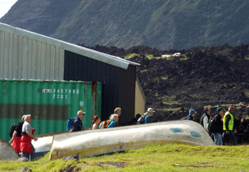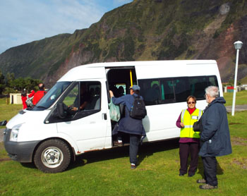 | The Plancius arrived Friday 8th April and anchored along side the Edinburgh that was offloading her final cargo. It was a sunny, calm day with a slight winter chill. The harbour was unusually busy with passengers and cargo arriving at the same time. Tours of the settlement and volcano started from the harbour with the Thatched House museum open for those that wished to visit. Other visitors spent time at the Tourism Centre gift shop, Post Office, Cafe da Cunha and exploring the settlement and Potato Patches. The golf match took place from 2pm until departure time. There was a guided trip by bus to the Potato Patches at 2.30 pmand then a tour of the Traditional Thatched House Museum. The last boat was at 5pm taking local guides for the outer island tours. Unfortunately sea conditions prevented landing on Saturday, but passengers were able to land on Nightingale Island on Sunday 10th April, dropping the guides back later in the day before the ship set sail for St Helena. |